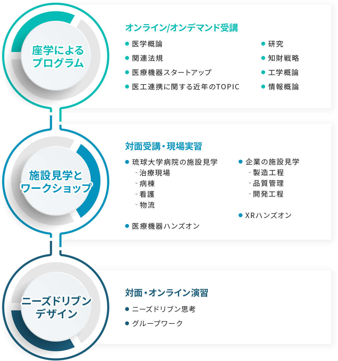 本プログラムは、医療分野と工業・IT分野の専門人材が相互の知見を学び合い、実践的な医工連携を推進するためのカリキュラムです。 受講生はご自身の専門領域に応じて、以下の履修要件に基づきカリキュラムを選択していただきます。