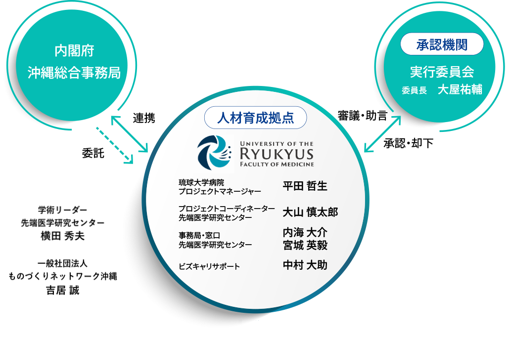 本プロジェクトは、内閣府の委託を受け、琉球大学医学部を中核拠点として、医療・製造・情報通信の各分野が連携しながら、次世代の医療を支える人材の育成を目指す取り組みです。
